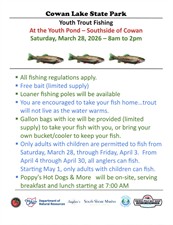 Join us for a family trout fishing day at the Cowan Lake State Park Youth Pond. ODNR will stock over 500 keeper-size rainbow trout. Everyone is encouraged to keep their trout, as they will not survive once the water starts to warm up. Ice and zip-lock bags will be provided to store your fish if needed (limited supplies). Loaner poles and bait will also be provided. All fishing regulations apply. Only adults with children are permitted to fish from Saturday, March 28, through Friday, April 3. From April 4 through April 30, all anglers, including adults only, may fish. This is to catch as many trout as possible before the water starts to warm up. Starting May 1, only adults with children are allowed to fish (normal rules). Poppy's Hot Dogs & More will be at the event starting at 7:00 AM, serving breakfast and lunch.